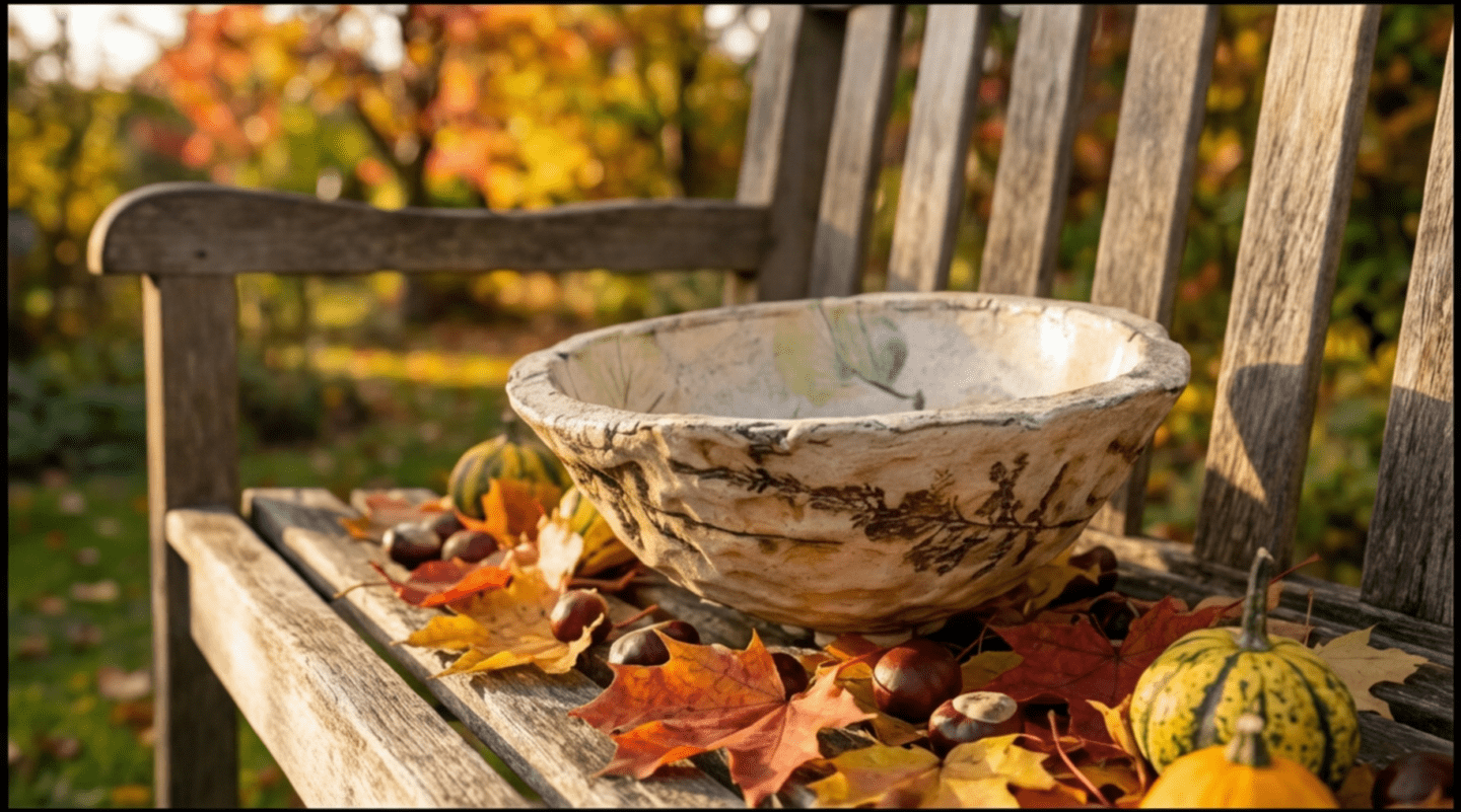 Přírodní tóny glazury a otisk rostliny na povrchu připomínají propojení s přírodou a jednoduchost bytí.