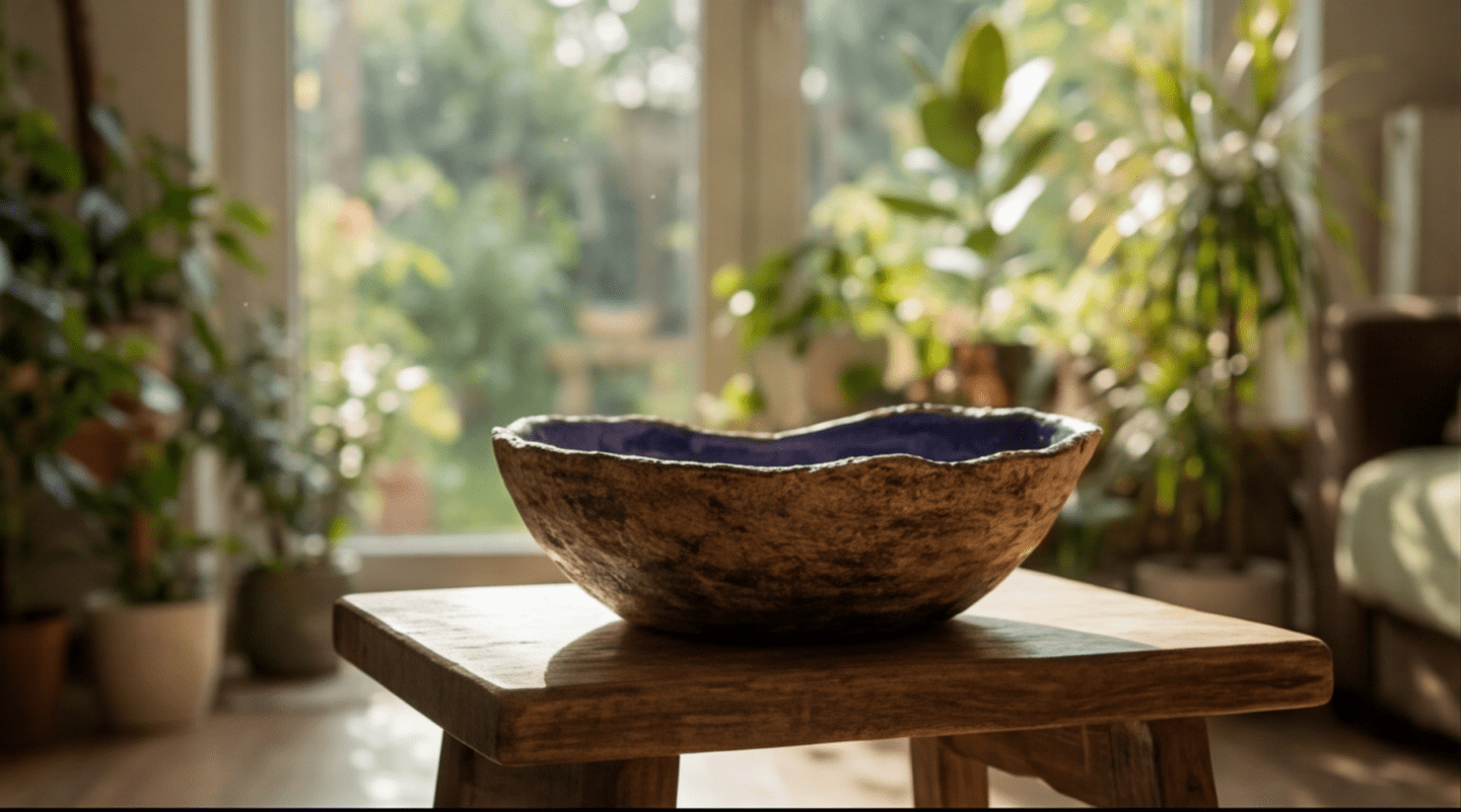 Přírodní, hrubší povrch v kontrastu s lesklým modrým vnitřkem vytváří harmonii země a vody. V zahradě se stává tichým místem setkání – pro ptáky i pro oči.